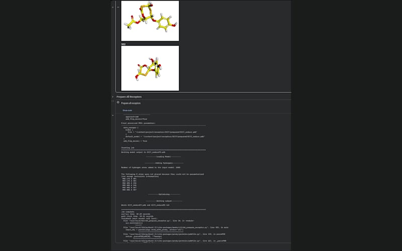 Setelah istirahat dilanjutkan dengan pengerjaan docking menggunakan google collab dan sudah berhasil melakukan bulk preparation untuk ligand dan receptors seperti terlihat namun masih belum sempat untuk melakukan bulk docking.