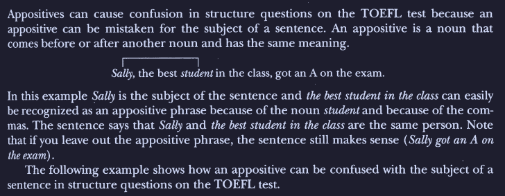 In this example you should recognize from the commas that George, is not the subject of the sentence. George, is an Appositive. Because this sentence still needs a subject, the best answer is (D), my.friend. Answers (A), (B), and (C) are incorrect because they are not subjects. The next example shows that an appositive does not always come after the subject; an appositive can also come at the beginning of the sentence.