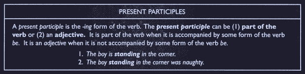 A present participle is the -ing form of the verb (talking, playing). In structure questions on the TOEFL test, a present participle can cause confusion because it can be either a part of the verb or an Adjective. It is part of the verb when it is preceded by some form of the verb be.